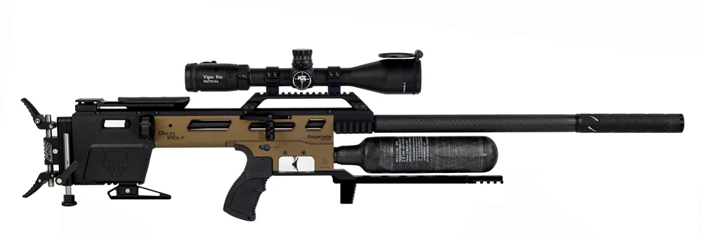 The Daystate Delta Wolf represents a leap forwards for daystate moving to a completely new format and electronics package. Designated as AVT (Advanced Velocity Technology), a modular system allows for fast interchange of components giving more options for shooters, and making assembly of different models using common components fast and straightforward. An integral regulator by specialist HUMA-Air added to a chronograph controlled electronic firing system, and a quick change barrel allows for fast calibre and barrel and power changes all of which can be controled in the field by the shooter. Delta Wolf introduced in March 2020 an the Alpha Wolf version in 2022. Various sub models have been released including a smart version which removes the chronograph and a performance version that adds many accessories as standard.